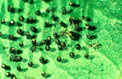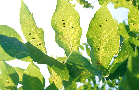 resembles that of lacebugs. Spider mites do not leave black fecal spots.