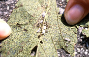 Note adult lacebugs with white reticulate wings near the midrib. Undersides