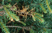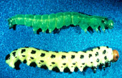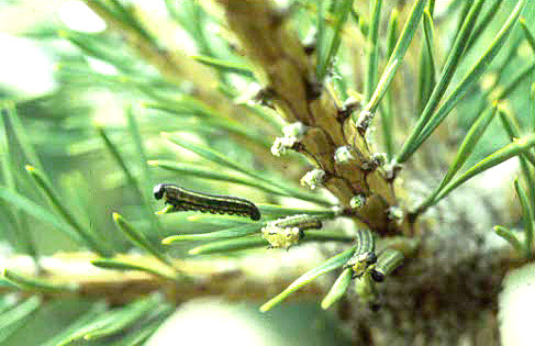 defoliate pine needles. Each of the small black headed larvae near the