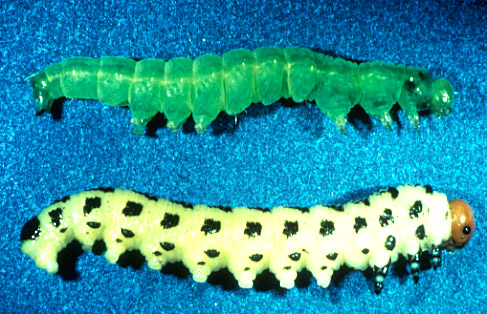 The top larva is a caterpillar. Note how it