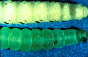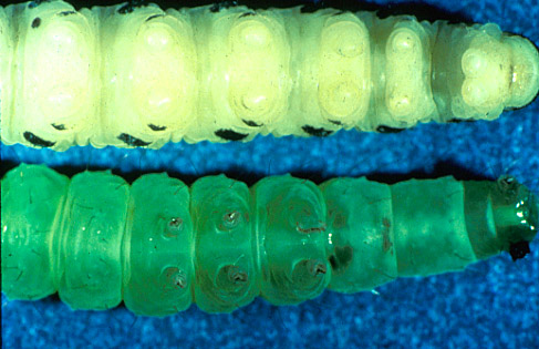 Prolegs of the white larvae (red headed pine sawfly) are naked and