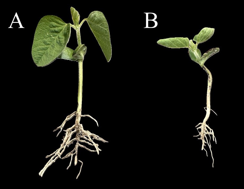 Figure 1: Soybean with no residual herbicide application (A) compared to soybean exhibiting injury caused by cool, wet conditions following an early spring Fierce XLT application at 4.5 oz/acre (B).