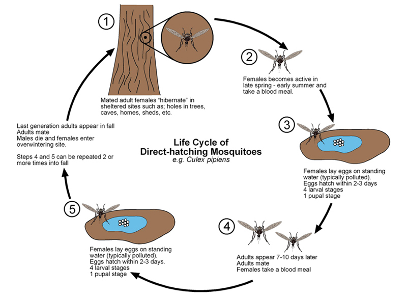 Direct-hatching eggs are laid on top of shallow standing water and hatch within 2-3 days. Indiana mosquitoes that have direct-hatching eggs include those that are vectors of West Nile Virus, namely species in the genus Culex.