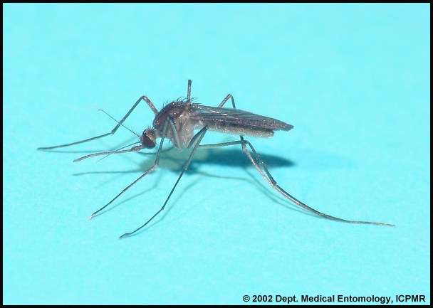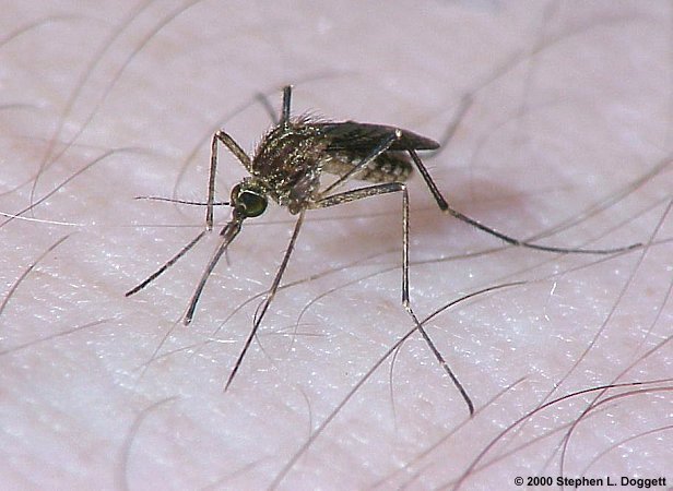 Known as a vector for the West Nile virus, this Culex mosquito has landed on a human finger. Culex: Species of Culex include a complex known as "house mosquitoes" and, more recently, "West Nile mosquitoes" because of their involvement in the transmission of West Nile Virus. There are about 28 species of Culex in the continental United States. Seven species occur in Indiana, of which four are involved in the transmission of West Nile Virus among birds and potentially to humans and horses. In addition to West Nile Virus, certain species of Culex are known to transmit St. Louis Encephalitis Virus and Western Equine Encephalitis Virus.