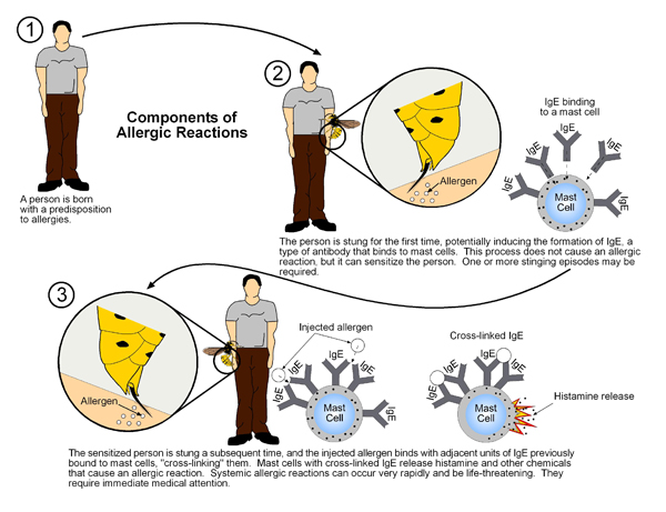 Allergic reactions involve a sequence of complex "steps." The explanation begins with a person who is prone to allergy being stung by a species of social Hymenoptera for the first time. This initial exposure to the venom does not induce an allergic reaction. One or more stinging episodes is needed to induce the primary immune response, which is described below.